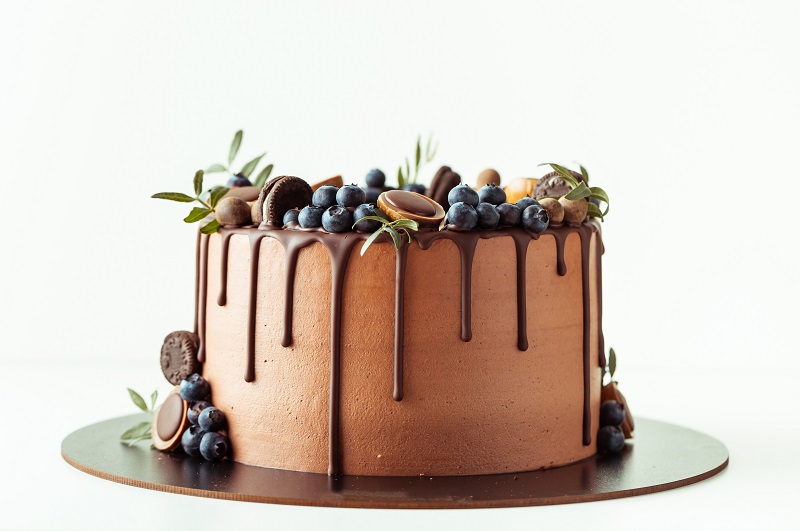 Chocolate cake with chocolate drip. Garnished wih blueberries, chocolates and leaves.