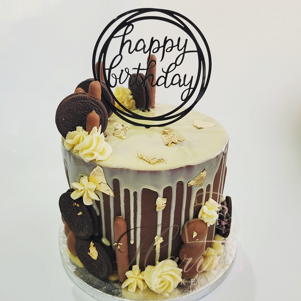 Chocolate oreo cake covered with a white chocolate drip. Decorated with piping and Kinder chocolates.